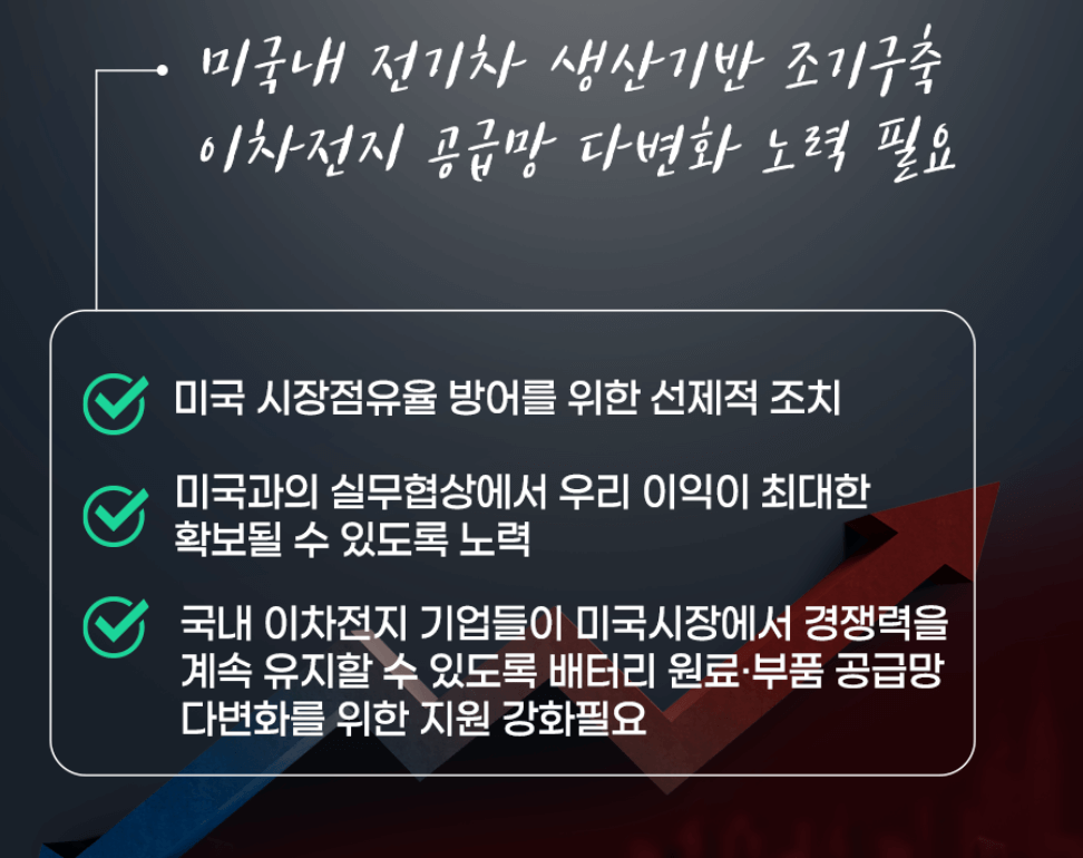 2025년까지 중국 중심의 공급망은 재편이 필요한 실정이고, 실제 중국 등 '우려 대상 외국법인'이 제조한 배터리 부품은 2024년부터, 이들이 추출, 가공한 배터리 광물은 2025년부터 보조금 지급대상에서 제외되기 때문에 해당 배터리로 제작한 전기차의 경우 실제 가격 경쟁력을 상실하게 됩니다.