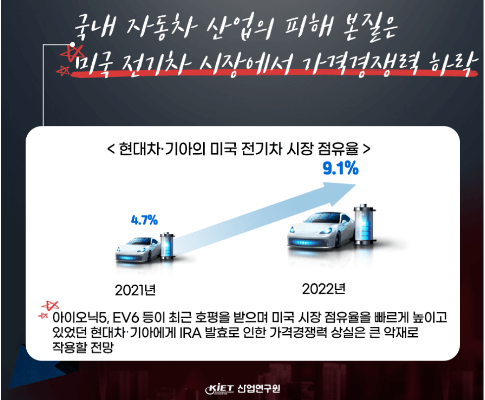 다만, 현대차/기아차 등 국내에서 조립 후 미국으로 수출하여 판매하는 국내 전기차의 시장 점유율이 IRA 발효에 따라 보조금을 지급 받을 수 없어 가격 경쟁력 하락에 따른 감소세로 돌아섰습니다.