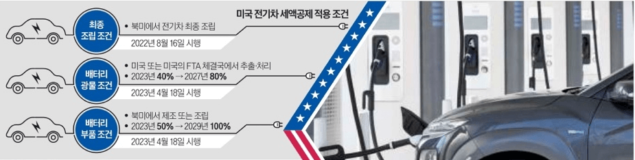 4월 18일을 기준으로 북미산 배터리 부품을 50% (2029년 100%) 이상 쓰거나, 미국과 자유무역협정을 체결한 국가와 일본 등에서 가공한 배터리 광물을 40% (2027년 80%) 이상 사용하면 전기차 한 대에 각각 3750달러의 세액공제 혜택을 받게됩니다.