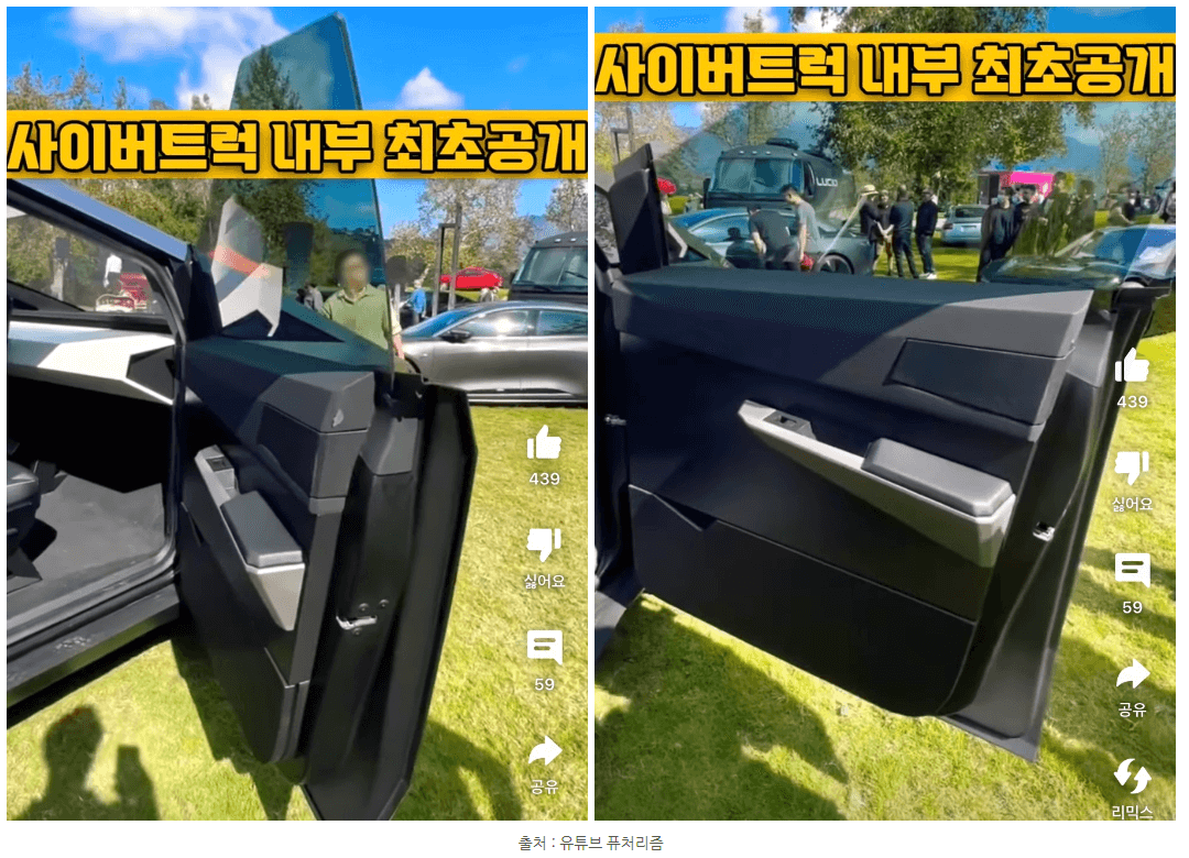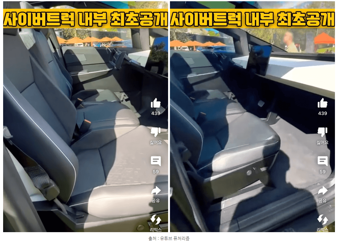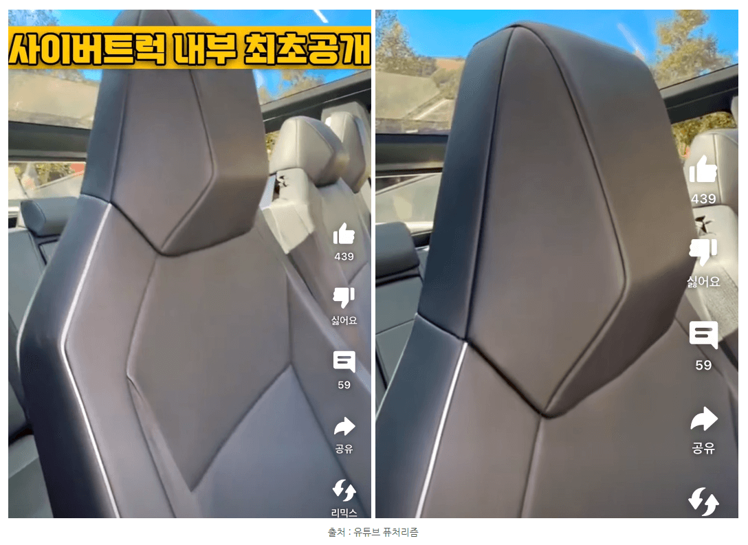 최근에는 테슬라 트럭의 실내가 처음으로 공개되었는데요. 자동차 계의 애플이라고 할 정도로 심플하고 직관적인 실내 인테리어로 관심을 끌고 있습니다. 도어는 깔끔하게 프레임리스로 도어 버튼 역시나 깔끔하게 티가 나지 않을 정도로 디자인 되어있습니다. 시트도 사이버 트럭의 외관의 형상 본떠 각진 모습이 독특합니다.