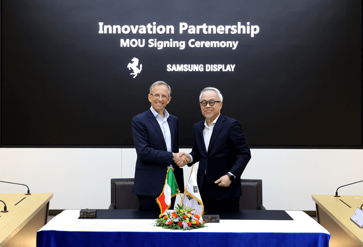 삼성디스플레이는 베네데토 비냐 페라리 최고경영자(CEO)가 충남 아산캠퍼스를 찾아 최주선 사장과 차량용 디스플레이 솔루션 개발 관련한 양해각서(MOU)를 체결했다고 밝혔습니다. 향후 삼성디스플레이는 페라리의 차세대 모델에 탑재될 디스플레이 솔루션을 개발하고, 디지털 전환을 지원한다는 계획입니다.