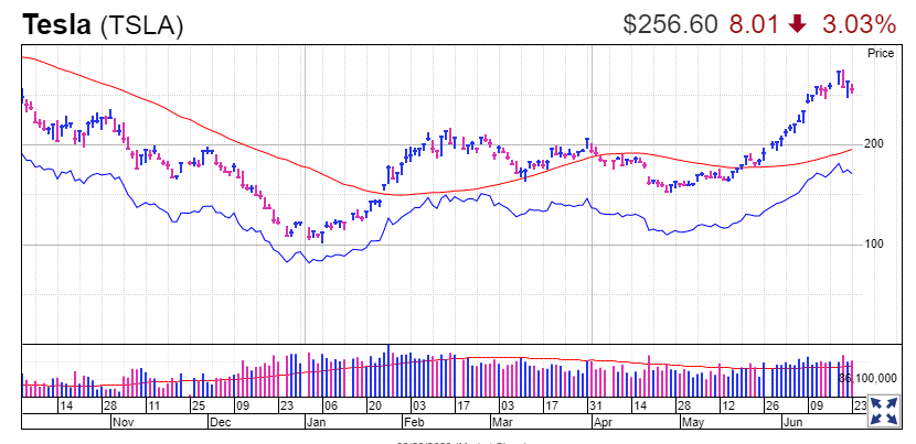 지난 수요일(6/21) 주식이 하락하기 전에 테슬라는 13일 연속 상승을 기록했습니다. 주식은 2021년 1월 3일 이후로 약 140% 상승했습니다. 그러나 테슬라는 2021년 11월에 달성한 역대 고점인 414 달러로부터 36% 하락했습니다.