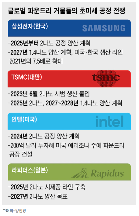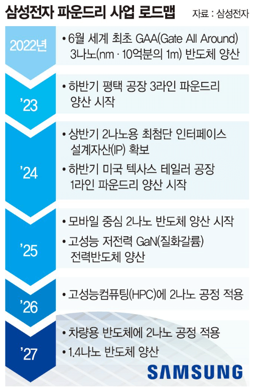 삼성전자는 2025년 2나노미터(㎚·1㎚는 10억분의 1m) 공정에서 모바일 칩을 양산하고 2026년 고성능 컴퓨팅, 2027년 자동차용으로 확대 적용할 계획입니다.