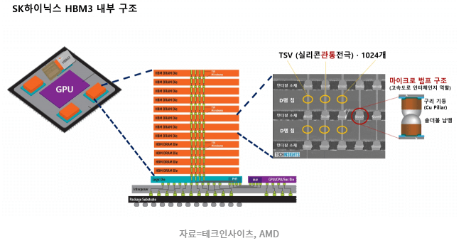 HBM은 여러 개의 D램을 수직으로 쌓은 뒤 1024개의 구멍(데이터 통로)을 뚫어 연결한 제품으로 D램을 많이 쌓은 만큼 데이터 저장 용량이 크고 데이터 처리 속도는 일반 D램과 비교해 열 배 이상 빠르다고 알려져 있습니다. 제품 가격은 일반 D램보다 다섯 배 이상 비쌉니다.
