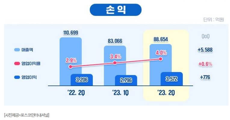 글로벌사업 부문도 매출 7조 8843억원과 영업이익 1490억원의 실적을 기록했습니다. 글로벌 수요회복이 더딘 상황에서도 고객사 다변화 전략을 통해 친환경 철강, 친환경 모빌리티 제품 판매 확대를 이뤄낸 결과입니다.