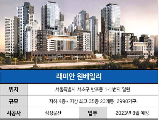 래미안원베일리는 기존 신반포3차와 경남아파트를 통합 재건축해 조성된 아파트입니다. 총 23개동 2990가구 대단지입니다.