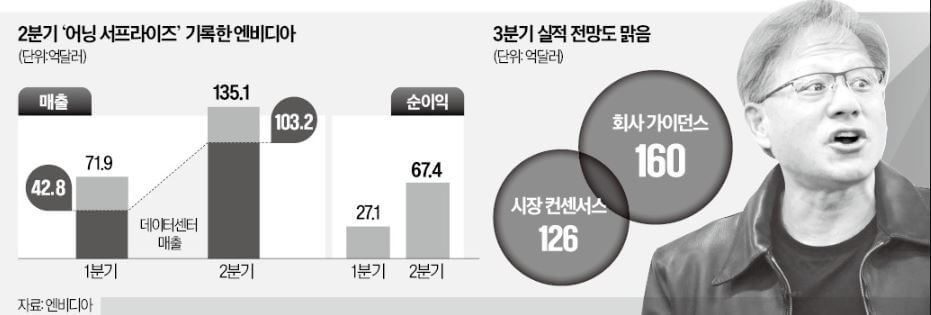 예상대로 엔비디아가 2분기에 ‘어닝 서프라이즈’를 기록했습니다. 다음 분기 매출 전망치도 월가 예상치를 훨씬 웃도는 160억달러를 제시하는 등 하반기에도 고속 성장을 이어갈 것임을 예고했습니다.