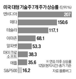 매그니피센트 세븐은 현재 미국 증시를 주도하고 있는 애플, 마이크로소프트(MS), 알파벳, 아마존, 엔비디아, 테슬라, 메타 등 7개 종목을 뜻합니다. 올해 들어 이들 종목의 상승률은 35~207%로, S&P500 등 주요 지수의 상승을 견인했습니다. 이들 가운데 상위 5개 종목이 S&P500 시가총액 가운데 4분의 1가량을 차지할 정도입니다. 반면 매그니피센트 세븐을 제외한 나머지 S&P500 종목의 주가는 올 들어 대부분 보합입니다.