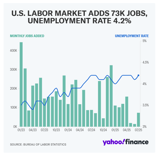 8월 1일 발표된 7월 고용지표에 따르면, 미국 경제는 지난달 7만3천 개의 일자리를 추가했지만, 5월과 6월 수치가 수정되면서 25만8천 개의 일자리가 사라졌다. 이 발표 직후 트럼프 대통령은 노동통계국(BLS) 국장을 해임했다. 지난 3개월 동안 일자리 증가는 월평균 불과 3만5천 개에 그쳤다.