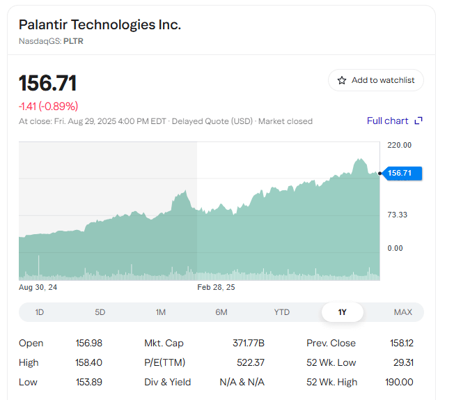팔란티어는 정보기관을 위한 소프트웨어 플랫폼을 개발 및 배포하는 기업입니다. 최근 한 달간 팔란티어의 수익률은 -1.03%였으며, 지난 52주 동안 주가는 405.55% 상승했습니다. 2025년 8월 27일 기준 팔란티어 주가는 주당 156.72달러로 마감했으며, 시가총액은 3,717억 9,300만 달러에 달했습니다.