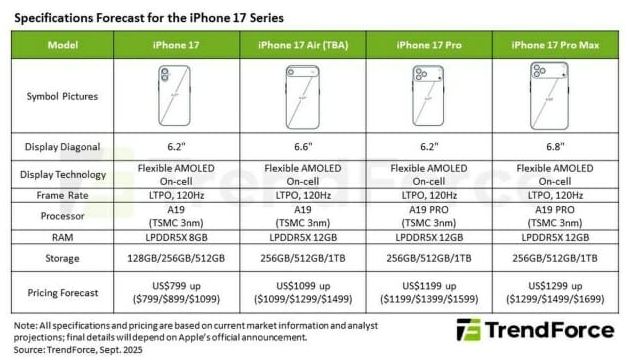 다음 주 공개될 애플의 슬림형 ‘아이폰17 에어’의 구체적인 가격 정보가 나왔다. IT 전문매체 맥루머스는 4일(현지시간) 대만 시장조사업체 트렌드포스 보고서를 인용해 아이폰17 에어 시작 가